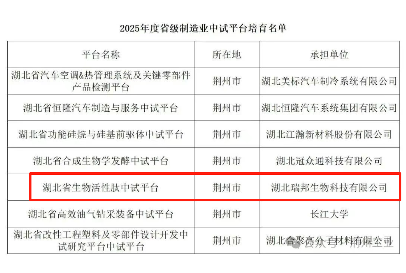 喜訊頻傳!瑞邦生物【生物活性肽中試平臺】正式入選2025年度湖北省省級制造業(yè)中試平臺培育名單!這是對...